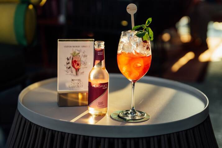 Un leggero e rinfrescante collins in chiave delicatamente fruttata. Le note floreali ed erbacee fanno da contraltare al carattere frizzante della soda biologica ORGANICS che regala un finale unico al palato.
