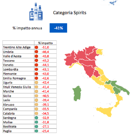 Tradelab nel 2021 stima un impatto pari a – 37% per il sell in vino e pari a – 41% per il sell in spirits. Ecco la situazione nelle diverse regioni. Riduzioni più marcate nel centro-nord, il Trentino Alto Adige presenta le percentuali maggiori di riduzione.