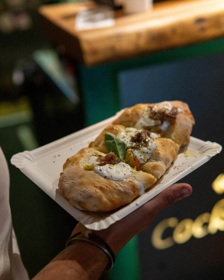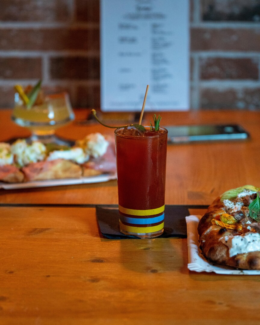 1) Pizza fiori di zucca, stracciatella e alici – “Tomatillo Loco” (Mezcal, Gin, spicy mix, ‘Loco’ tomato mix)