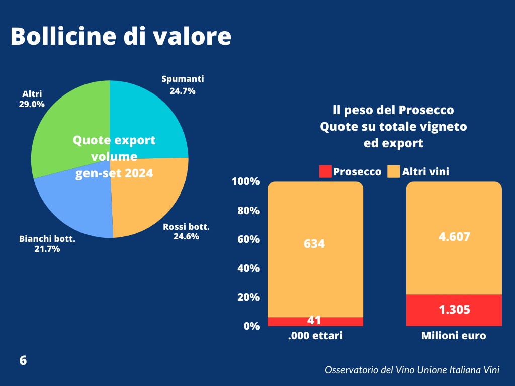 Secondo Uiv, la cosa più straordinaria – e che al contempo deve far riflettere – è che se dici spumante, non puoi che fare il nome di “Prosecco”. Non solo perché vale il 75% del totale spumante, ma anche perché il miliardo e 300 milioni di euro generato da gennaio a settembre viene da un fazzoletto di terra: 40.000 ettari circa sommando le tre denominazioni (Conegliano Valdobbiadene, Asolo e Prosecco Doc). Il 6% del totale a vigna nazionale che in termini di valore (+12%) rivendica il 22% dei 6 miliardi di export targato Italia.