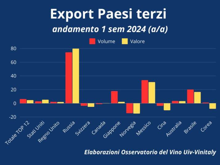 UIV Export vini Italia: rallenta la corsa extra-UE nel 1° semestre 24 (+6,3% a volume, +4,7% a valore)