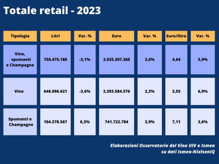 Tornano di poco sotto quota di 1 miliardo le bottiglie di vino vendute nei negozi e nella grande distribuzione italiana nel 2023, il 3,1% in meno rispetto all’anno precedente per un valore complessivo di poco più di 3 miliardi di euro. Lo rileva l’Osservatorio Uiv-ISMEA su base Ismea-Nielsen-IQ in relazione alle vendite di vino in Gdo e retail a tutto il 2023.