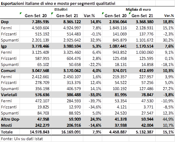 Secondo le elaborazioni su base Istat, il vino italiano guadagna posizioni in tutti i suoi fondamentali: oltre al valore, aumentano i volumi (+7,9%, 16,2 milioni gli ettolitri esportati) e soprattutto il prezzo medio, a +7%. Un dato importante, quest’ultimo, che però secondo Uiv va solo a parziale compensazione delle perdite che le aziende stanno subendo a causa del balzo dei costi di materie prime, di energia elettrica e trasporti. A trainare il mercato, l’ennesimo exploit degli sparkling che incrementano del 28,6% sia in volume che a valore, con l’Asti a +13% e il Prosecco che vola a quasi +40% grazie anche all’enorme balzo della domanda statunitense. I consumi post lockdown di vino italiano nel mondo privilegiano i vini Dop imbottigliati (+18,8%), con i fermi a +15,1%, mentre è minore la crescita di Igp e vini comuni. Tra i formati, a conferma di una domanda che vira maggiormente verso i segmenti medio-alti, si segnalano in calo i bag in box (-11%), dopo l’exploit durante il lockdown, e lo sfuso (-5%).
