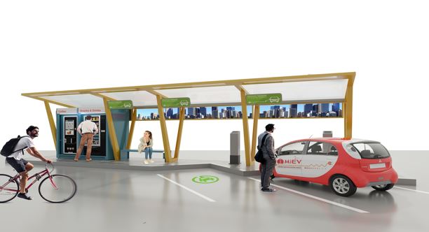 - colonnine di ricarica per veicoli elettrici, integrate ad alcuni servizi automatici di informazione e di distribuzione ristoro/beni di prima necessità (bibite caldo/freddo, medicinali, alimenti, etc.), informazioni, biglietteria, bancomat, ecc.