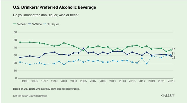 La birra rimane la bevanda alcolica preferita tra i bevitori americani con il 37% delle risposte, prendendo, rispetto al sondaggio dell’anno passato, ben due punti percentuali sul vino, ora al solo 29% delle preferenze. Ricordiamo che nel 2005 vi era stato un sorpasso del vino sulla birra (39% vs 36% delle preferenze) e che ancora negli anni 2011 e 2013 vi era stato un sostanziale pareggio tra le due bevande. Il 31% degli intervistati ha invece dichiarato a luglio di bere più spesso superalcolici: gli spirits hanno quindi per la prima volta dal 1939 superato il vino nelle preferenze di consumo.