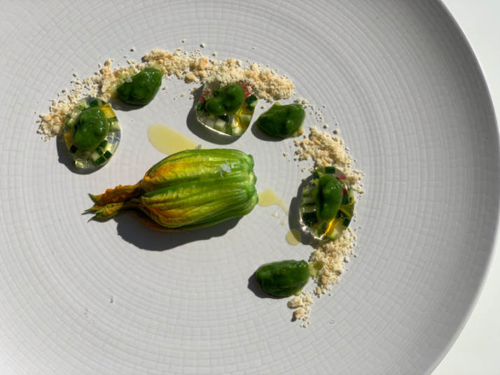 FIORE DI ZUCCA FARCITO CON RICOTTA DI PECORA, ASPIC AL BRODO DI ZUCCHINE E FIORI DI PRIMAVERA