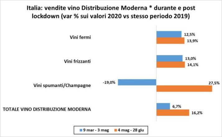 Nelle otto settimane successive, il trend delle vendite è risultato positivo per entrambe le categorie, ma con gli spumanti in grande “spolvero”: mentre le vendite di vini fermi e frizzanti sono cresciute di un altro 13,9%, quelle di spumanti e Champagne hanno messo a segno un +27,5%, con in testa gli Charmat Secchi a guidare il recupero (+32,4%).