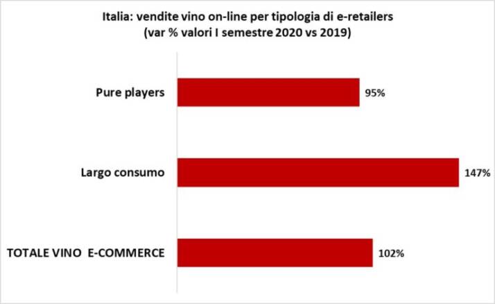 Al di là di queste differenze, è indubbio lo sviluppo del canale on-line nelle vendite di vino, una dinamica che ha interessato maggiormente gli operatori del largo consumo rispetto ai “pure player”. Secondo una stima Nomisma Wine Monitor – Nielsen, nel primo semestre di quest’anno le vendite on line di vino dei retailer del largo consumo sono aumentate del 147% contro una crescita degli specializzati che si è “fermata” a un +95%, sebbene questi ultimi siano stati responsabili dell’83% delle vendite e-commerce di vino in Italia (sempre a valori).