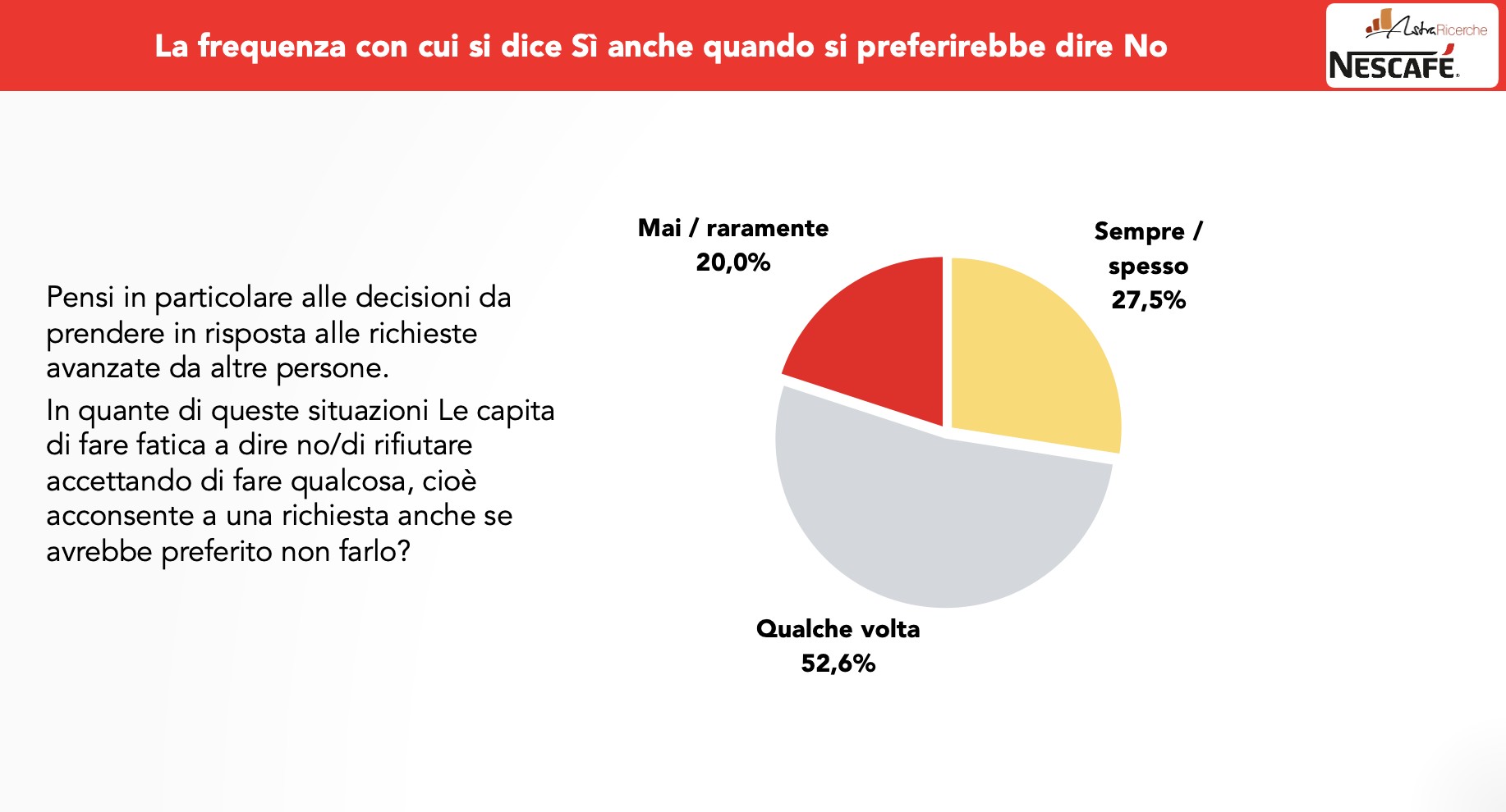 Per l’occasione, Nescafé ha commissionato a AstraRicerche uno studio sulle abitudini e le difficoltà degli italiani nel dire “no” nelle situazioni quotidiane, evidenziando come il cappuccino sia una scelta di relax per moltissimi. Infatti, il 50,1% degli italiani vede il cappuccino come una pausa essenziale, un momento di ristoro che vale la pena proteggere anche rifiutando inviti o richieste esterne.